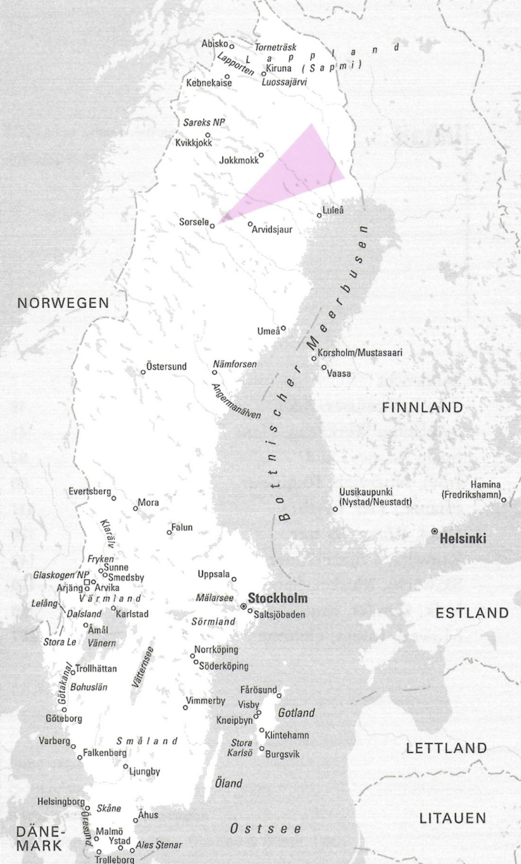Die Gemeinde Sorsele liegt nur wenig südlich des Polarkreises (N: 65°35'49'' / E: 17°29'58''), liegt in Schwedisch Lappland und ist punkto Fläche etwa so gross wie der Kanton Graubünden. Besiedelt wird dieses Gebiet von rund 2500 Einwohnern, das entspricht weniger als einem Bewohner pro km2. Die Zahl der Rentiere und Elche, die hier leben, ist dagegen deutlich höher. Überhaupt gibt es hier genügend Platz für Natur und Wildnis. Unter anderem gehört Europas grösstes Naturreservat Vindelfjällen zu Sorsele und als einer der wenigen naturbelassenen Flüsse fliesst der Vindelälven aus dem Vindelfjäll Naturreservat (Ammarnäs) durch das Gebiet von Sorsele Richtung Umeå, wo er in den Umeälven fliesst. Selbst ein Teil des Kungsleden (Königspfad) liegt auf dem Gemeindegebiet.